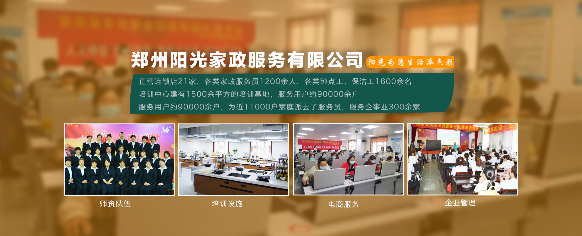 鄭州陽光家政服務(wù)有限公司成立于1998年,是鄭州市第 一家經(jīng)工商登記的家政服務(wù)企業(yè),是以家政服務(wù)、家政培訓(xùn)、社區(qū)服務(wù)、社區(qū)養(yǎng)老、托幼護理、清洗保潔為一體的社區(qū)生活服務(wù)集成商。公司有直營連鎖店21家,各類家政服務(wù)員1200余人,各類鐘點工、保潔工1600余名。鄭州陽光家政商學(xué)院建有1500余平方的培訓(xùn)基地,···